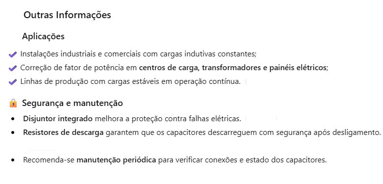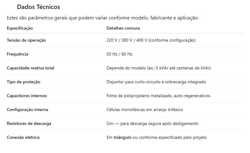 Correção permanente do fator de potência: componentes capacitivos permanecem ligados ao sistema para fornecer energia reativa de forma contínua, melhorando a eficiência energética e reduzindo multas por baixo fator de potência.