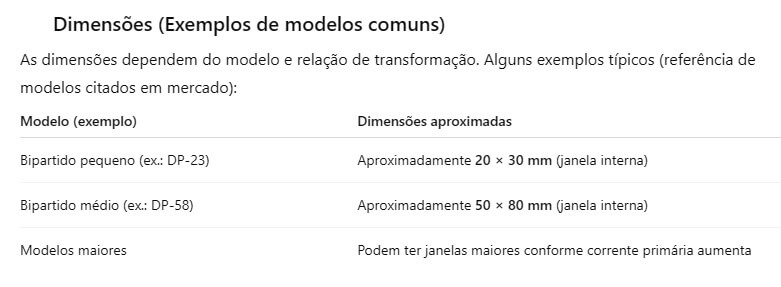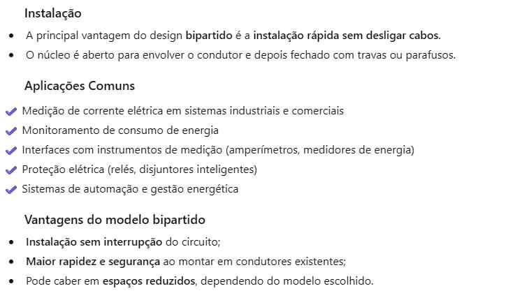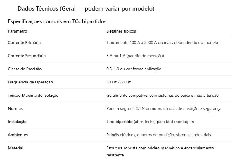 O transformador de corrente bipartido envolve o cabo condutor primário, funcionando como um sensor. Ele induz uma corrente proporcional no enrolamento secundário, que é ligada a instrumentos de medição (amperímetros, relés, medidores de energia, etc.).